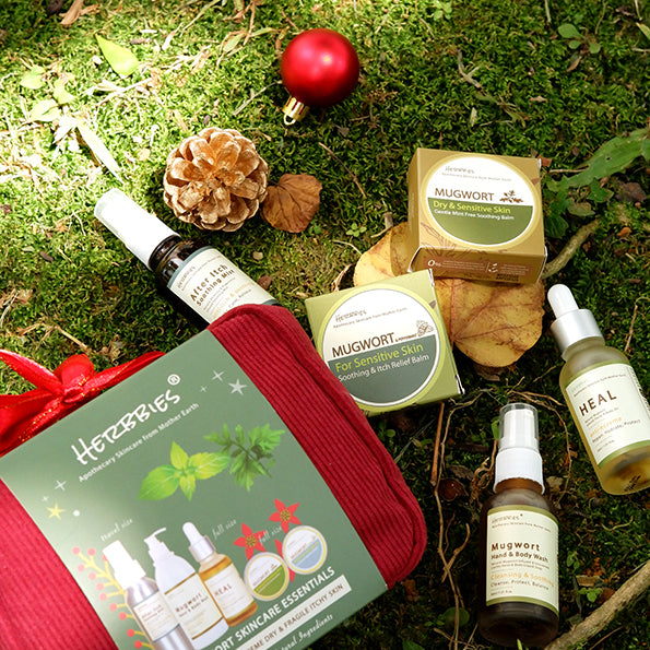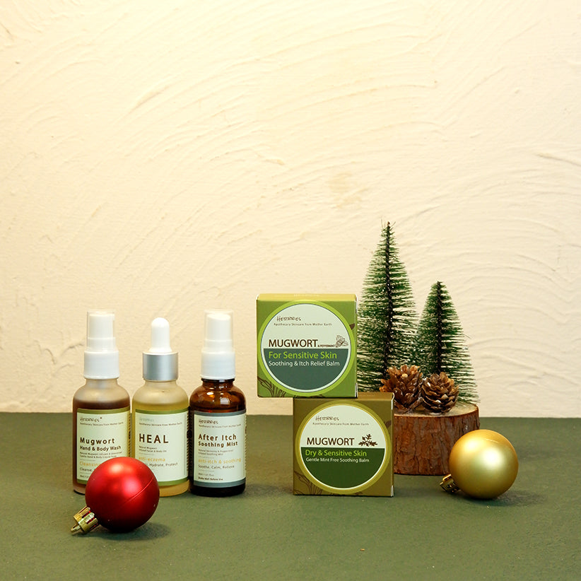 Explore our travel set—ideal allies for your skin’s journey. Relieve eczema with calming mugwort balms, rejuvenate with a refreshing liquid castile soap infused with Mugwort, soothe itchy skin using a peppermint mist, and wrap your skin in comfort with HEAL facial & body oil. Compact, portable, and radiating positive vibes, this kit ensures your skin stays happy and relaxed throughout the festive Christmas season. Wherever your adventures take you, this essential companion has your skincare needs covered.