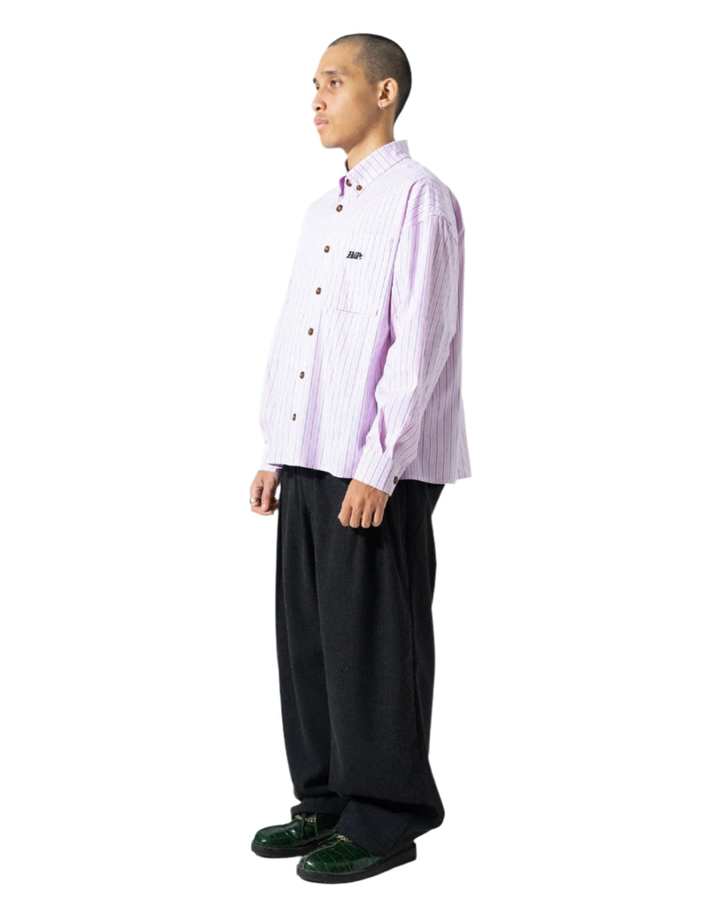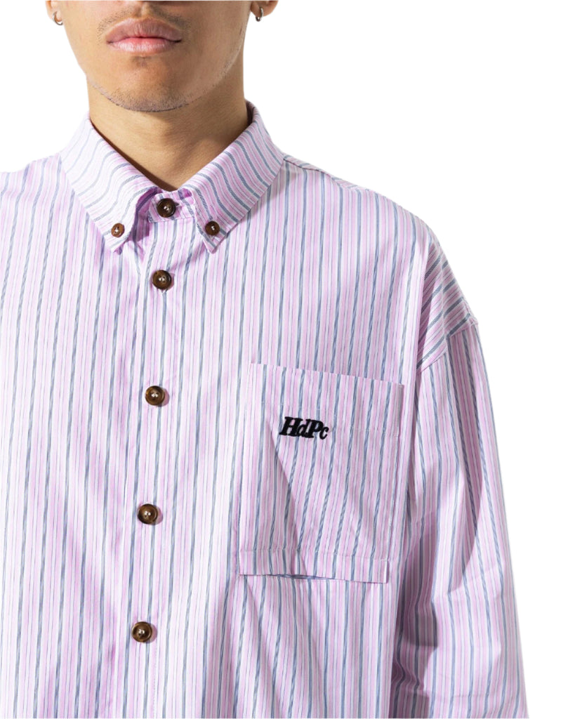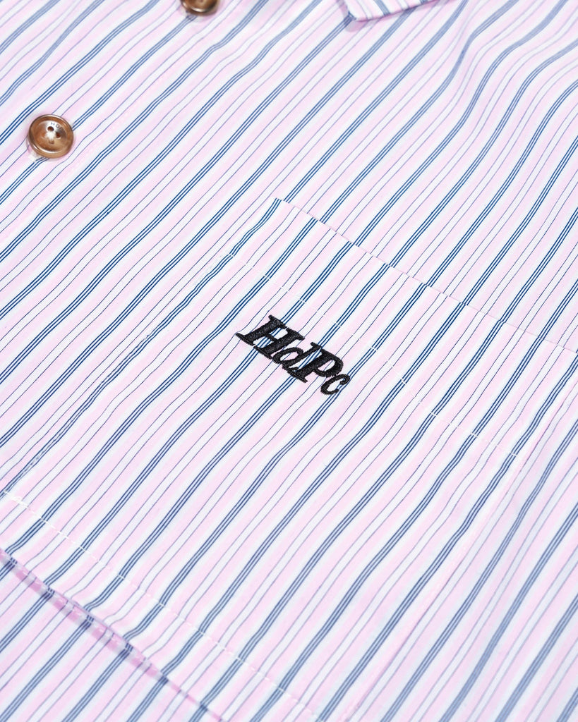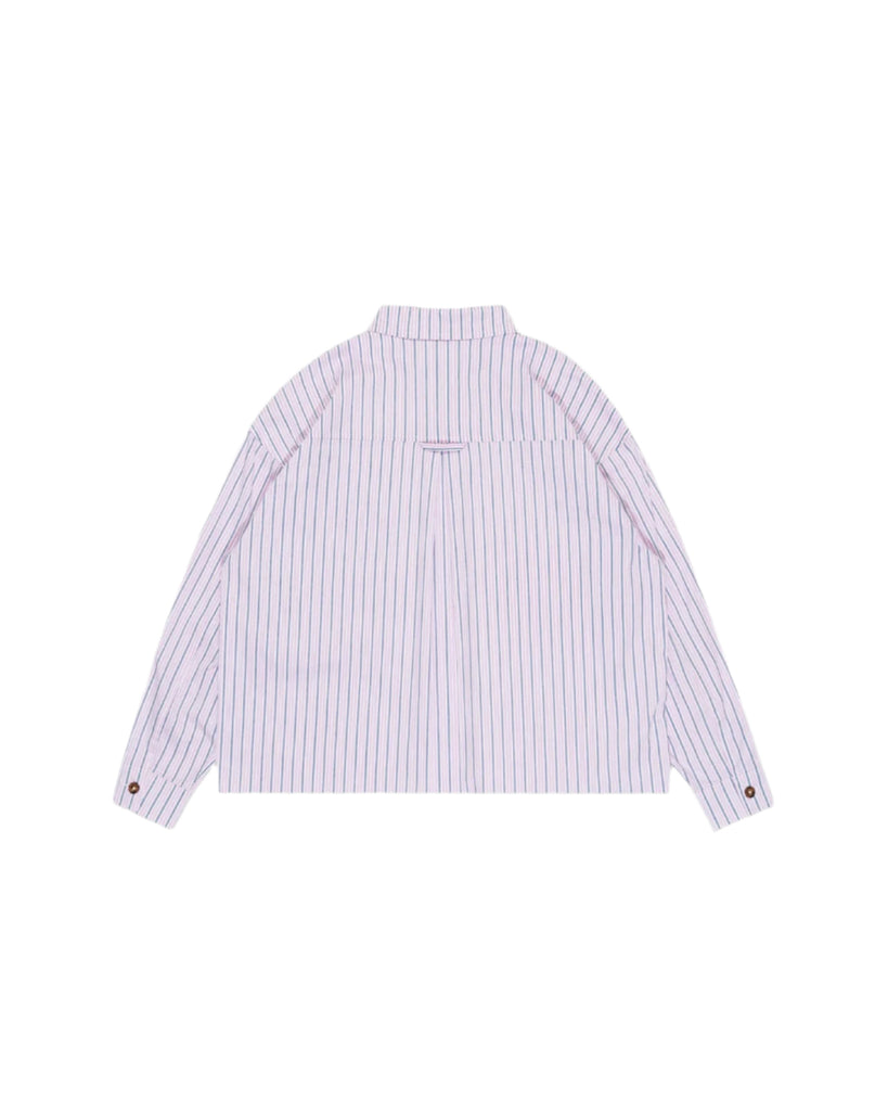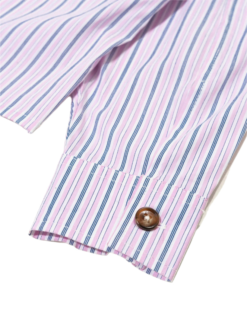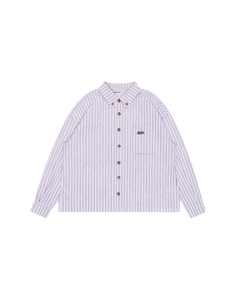 A pink striped long-sleeved shirt with a button-down collar and a front pocket featuring an embroidery logo.