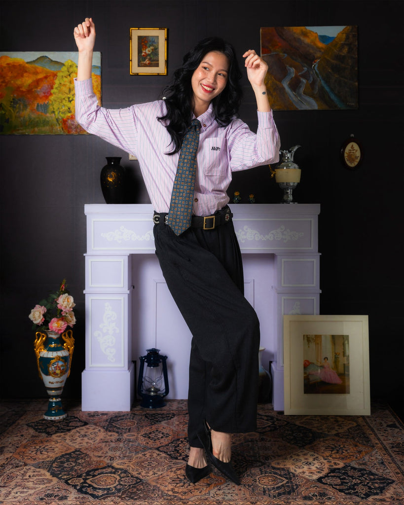 Woman posing with arms raised in a room with a fireplace and artwork on the walls.