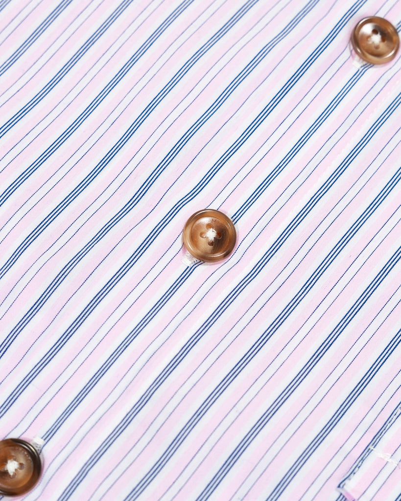 Close-up of a shirt with pink and blue striped pattern and brown buttons.
