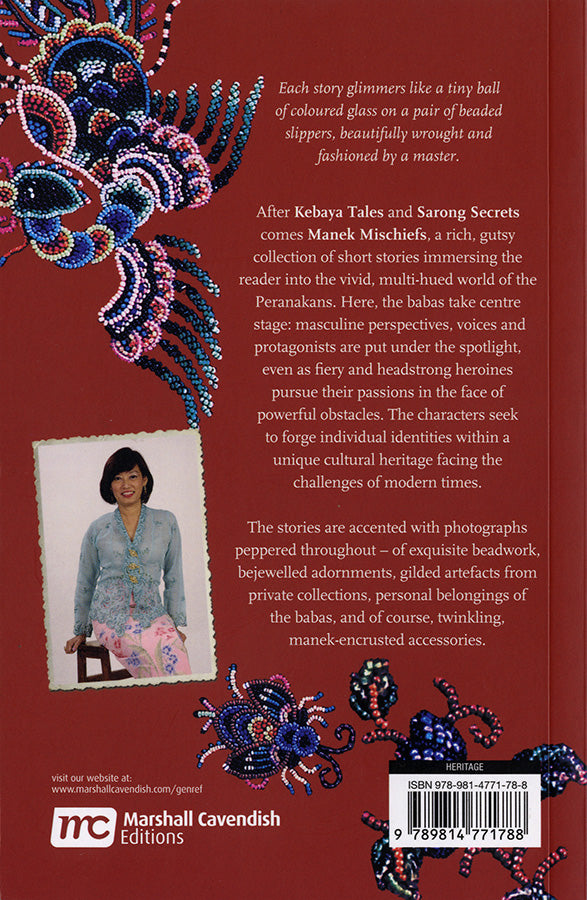 Selepas Kebaya Tales dan Rahsia Sarung datang Manek Mischiefs , koleksi cerpen yang kaya dan berani yang menyelami pembaca ke dalam dunia Peranakan yang terang dan pelbagai warna. Di sini, babas menjadi tumpuan utama: perspektif maskulin, suara dan protagonis diletakkan di bawah perhatian, walaupun heroin yang berapi-api dan keras kepala mengejar nafsu mereka dalam menghadapi halangan yang kuat. Watak-watak itu berusaha untuk membentuk identiti individu dalam warisan budaya yang unik menghadapi cabaran zaman moden. Diilustrasikan dengan banyak gambar artifak Peranakan dll.