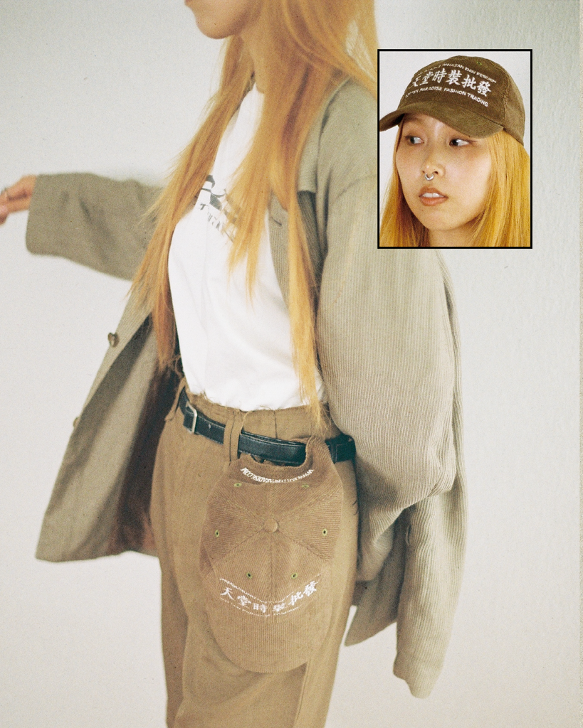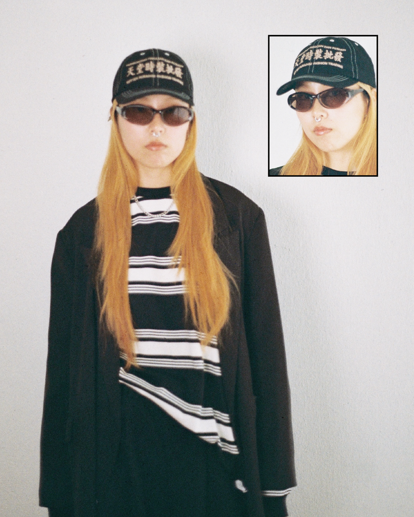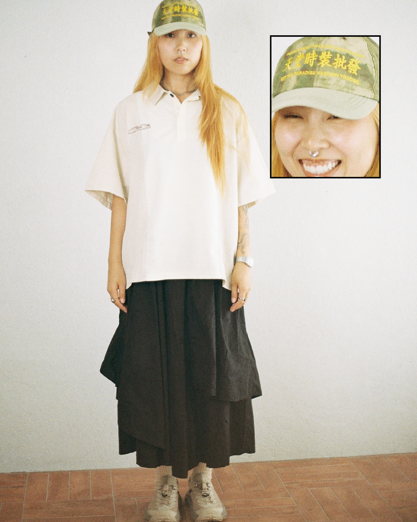 Person wearing a cap with text in a foreign language, blurred background