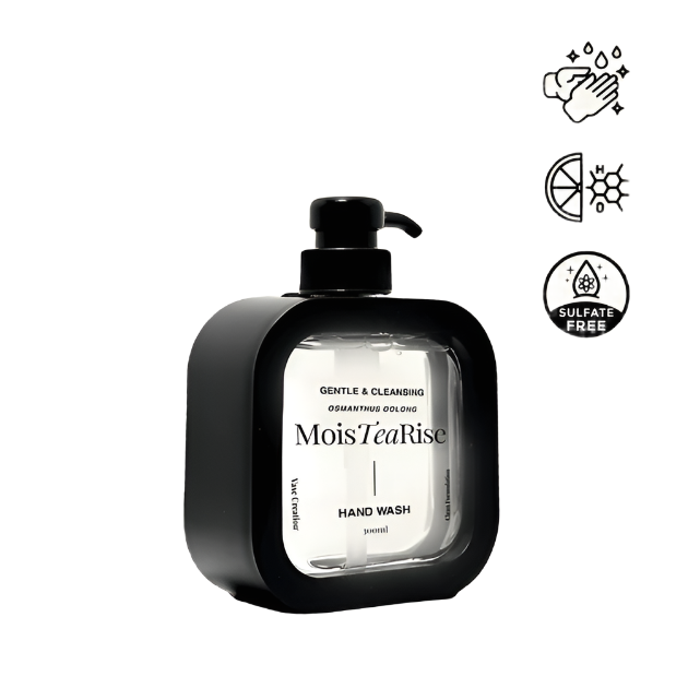 A pump bottle of Vase Creation MoisTeaRise hand wash with Osmanthus Oolong tea scent, featuring a black label and transparent container, displayed against a white background with icons indicating the product's features such as being gentle, cleaning, and sulfate-free.