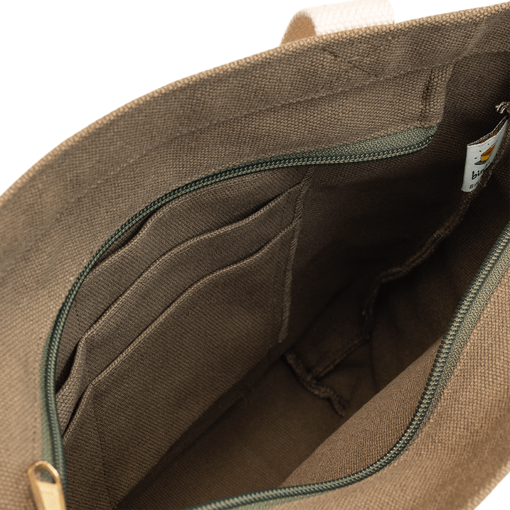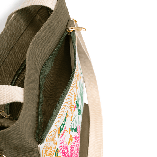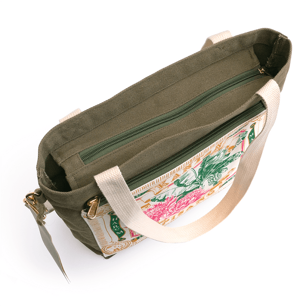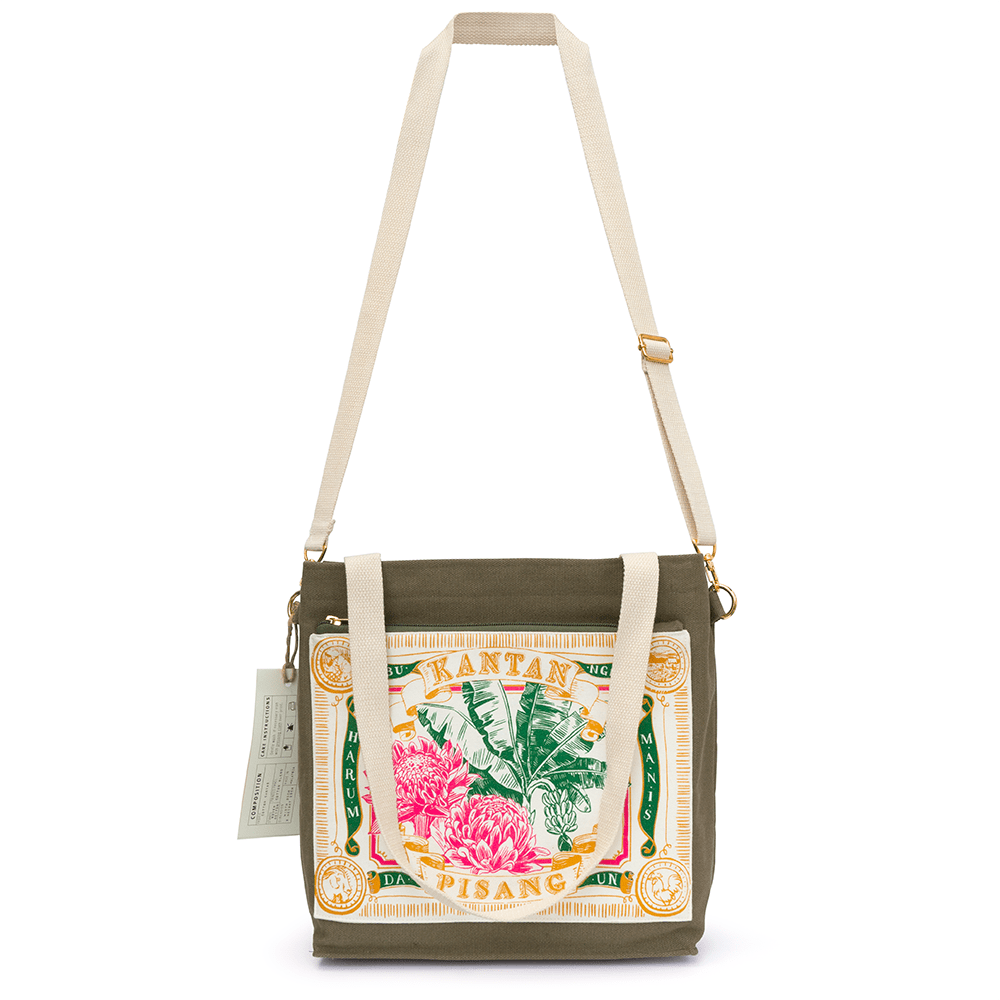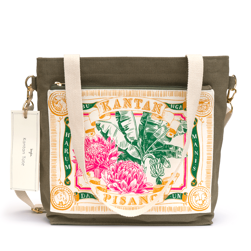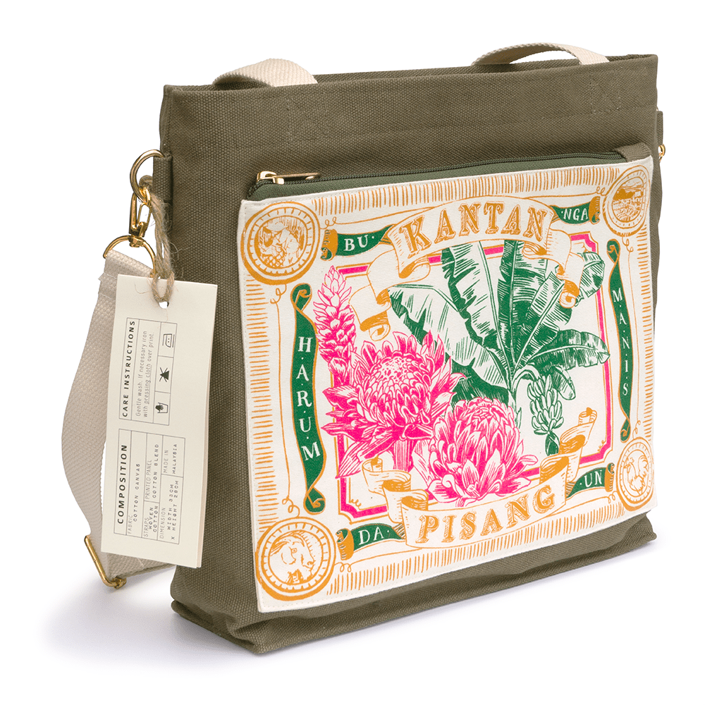 Beg kanvas hijau lumut ini memaparkan reka bentuk inspirasi Malaya lama kami yang retro, menampilkan bunga kantan (bunga halia) dan daun pisang (daun pisang), dua bahan penting dalam masakan Malaysia. Tote kantan diikat dengan zip di bahagian atas dan dilengkapi dengan poket berzip keluar di hadapan, selipar mudah di dalam poket di belakang, ditambah dengan organizer gantung di dalam. Oleh itu, keperluan semasa dalam perjalanan anda sentiasa dalam jangkauan!