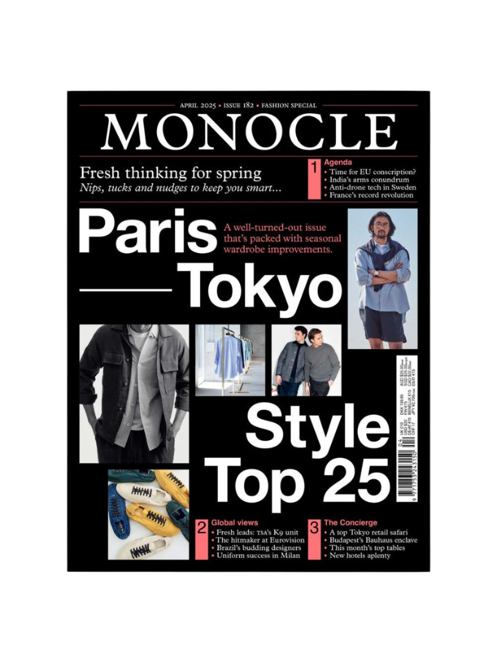 From Prada’s new trainer to Paris’s sharpest shirts and handcrafted Japanese menswear, Monocle’s team has crunched the numbers, travelled the world and is now ready to unveil this year’s top 25 designers, products and brands. Plus: our trusty Concierge takes us on a tour of Tokyo, we visit Brazil’s leading garden designer and we talk to the man who runs the show at Eurovision. Smarten up your style with Monocle’s fashion special.