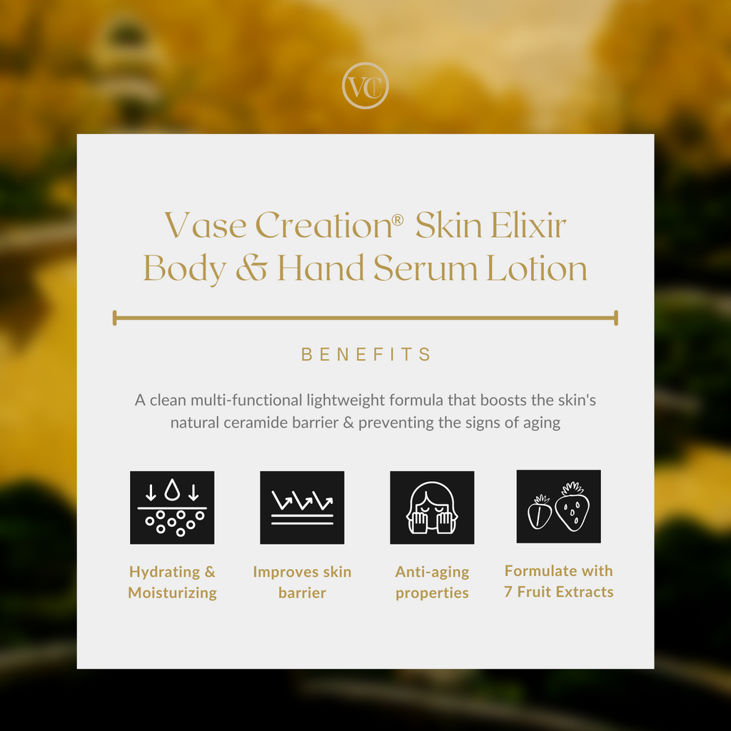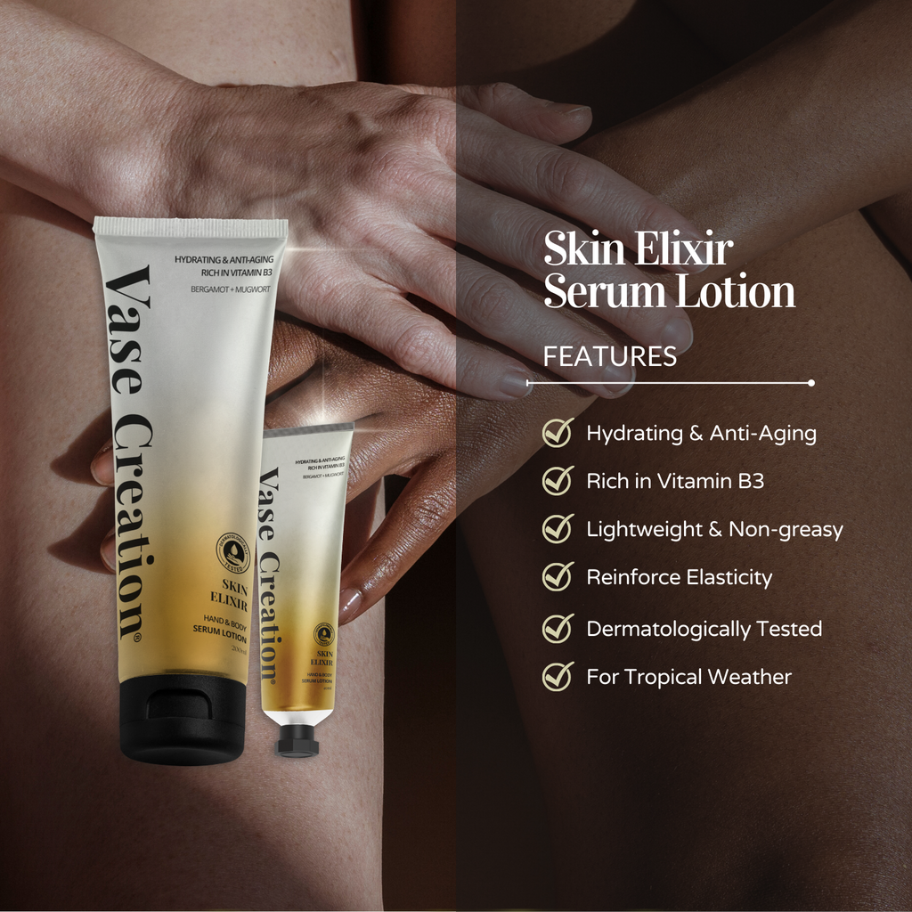 Vase Creation Skin Elixir Serum Lotion is a multi-functional serum lotion, which rich in Vitamin B3 and seven (7) natural fruit extracts, that strengthens your skin's natural ceramide barrier, reinforcing elasticity while restoring youthfulness and preventing premature aging. Dermatologically tested.