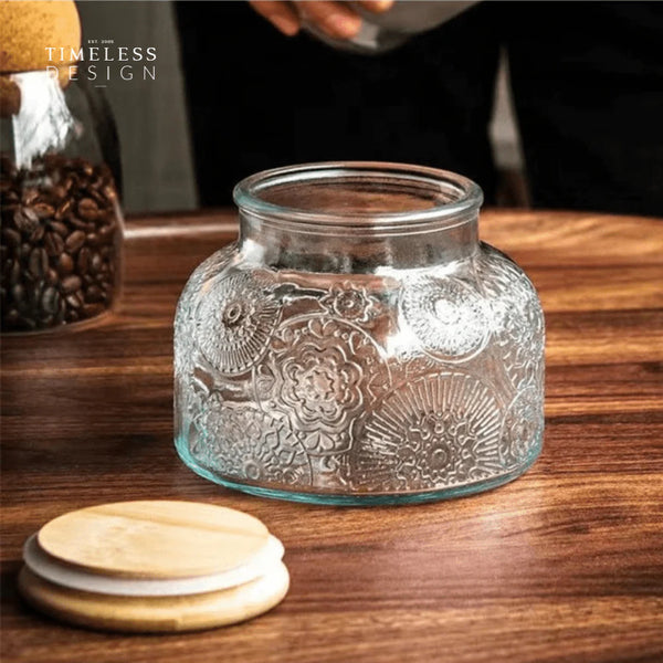 The Embossed glass in Begonia flowers pattern, healthy non-toxic, multi-purpose. perfect for storing nuts & dried goods, grains, coffee beans, biscuits, preserved fruits, herbs & spices can contain a creative vase for storage, can be a hydroponic vases. style and unique.